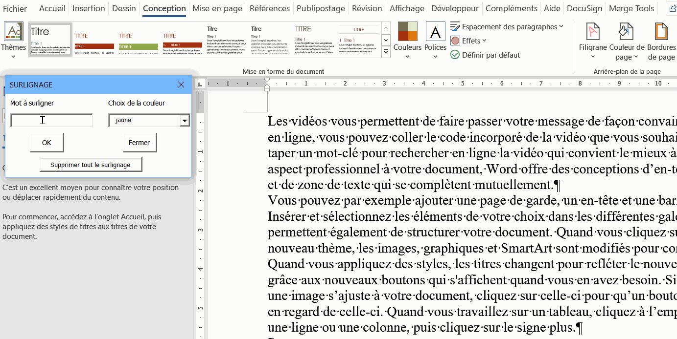 Plutôt que de proposer une macro dans laquelle il va falloir rentrer pour modifier le texte cherché, voici plutôt un modèle à télécharger qui va permettre de faire du surlignage via une boîte de dialogue.