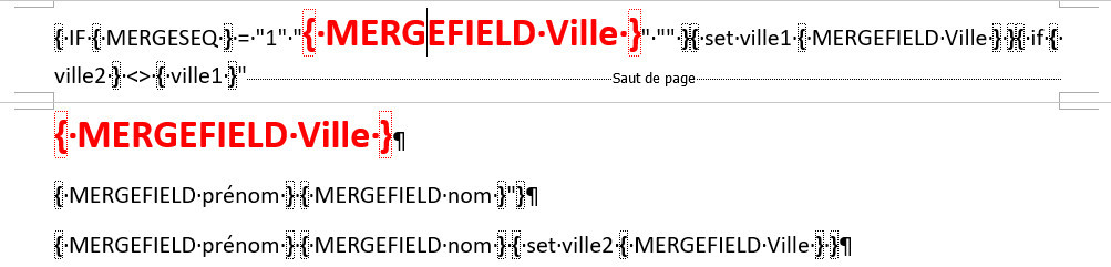 Exemple pour insérer un saut de page conditionnel à chaque changement de ville, lors d'un publipostage.